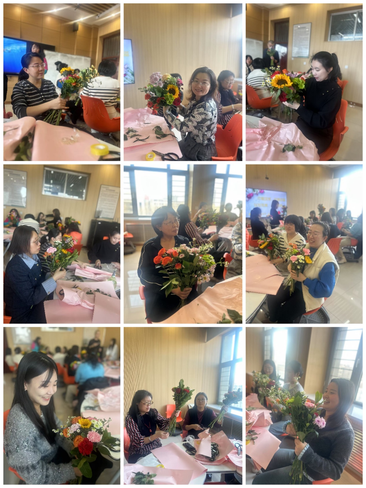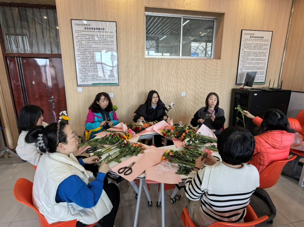 女教工们聚精会神聆听花艺师的讲解示范,在花艺师细致的指导下进行花卉选择、色彩搭配、花枝修剪和构图,教工们相互交流,相互帮助,现场洋溢欢声笑语。参加活动的女教工纷纷表示,这次活动不仅让她们学到了花艺技巧,还让她们感受到了艺术魅力和生活乐趣,并通过朋友圈分享喜悦心情,把美丽传给更多的人。